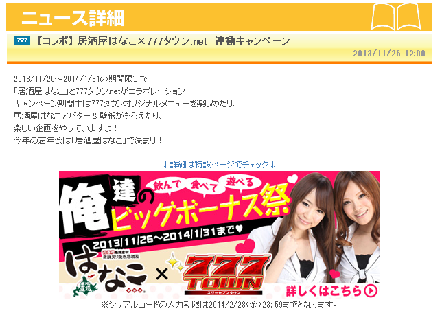 【コラボ】 居酒屋はなこ×777タウン.net 連動キャンペーン