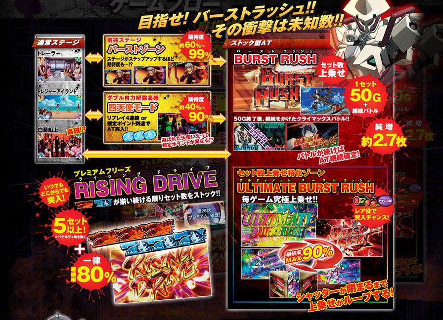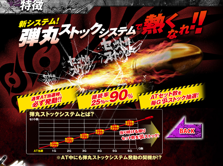 出玉増加のメインはストック型ATバーストラッシュ 純増役2.7枚、1セット50G+継続バトルのAT