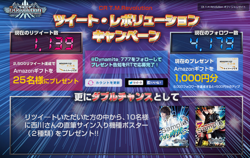 【Amazonギフトを当てよう!】CR T.M.Revolution登場記念キャンペーンを実施中!@Dynamite_777をフォロー後、このツイートをRTして、賞品をパワーアップさせよう!応募は10/31(金)まで http://t.co/mNZdtPY0d1 #ダイイチrev