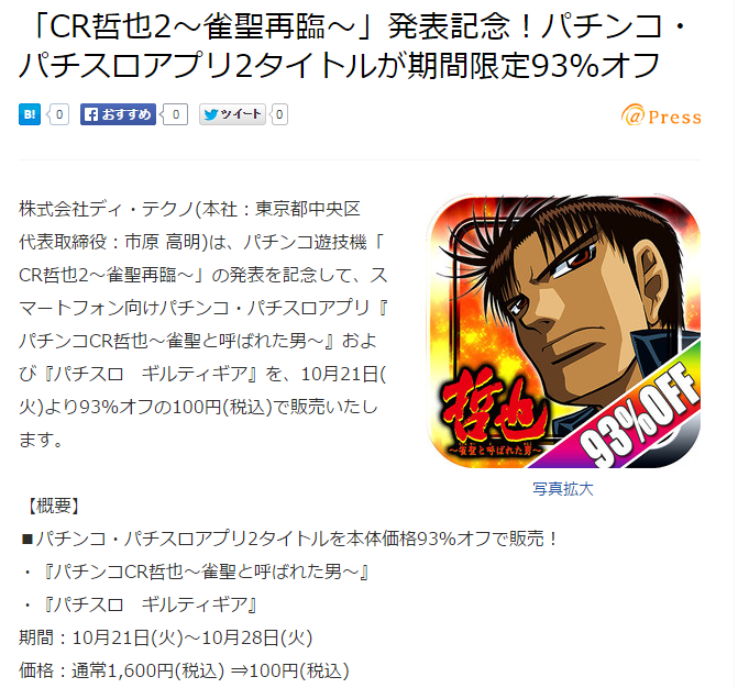 株式会社ディ・テクノ(本社:東京都中央区 代表取締役:市原 高明)は、パチンコ遊技機「CR哲也2~雀聖再臨~」の発表を記念して、スマートフォン向けパチンコ・パチスロアプリ『パチンコCR哲也~雀聖と呼ばれた男~』および『パチスロ ギルティギア』を、10月21日(火)より93%オフの100円(税込)で販売いたします。
