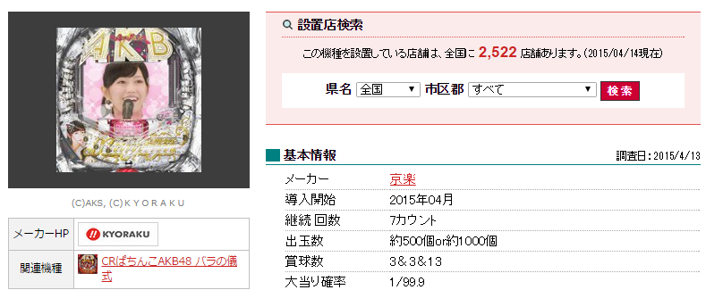 京楽「ぱちんこAKB48バラの儀式~SweetまゆゆVersion~」設置店舗は2,522