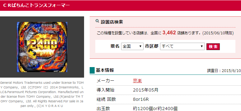 京楽 CRぱちんこトランスフォーマーは3,462店舗で設置中