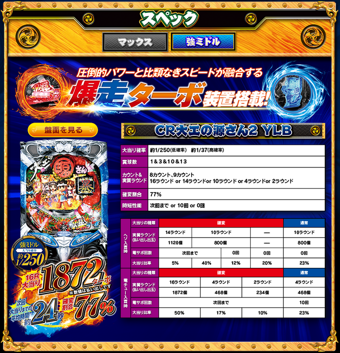 「CR爆走 大工の源さん外伝 -京都もいただき編-」公式サイトよりスペック