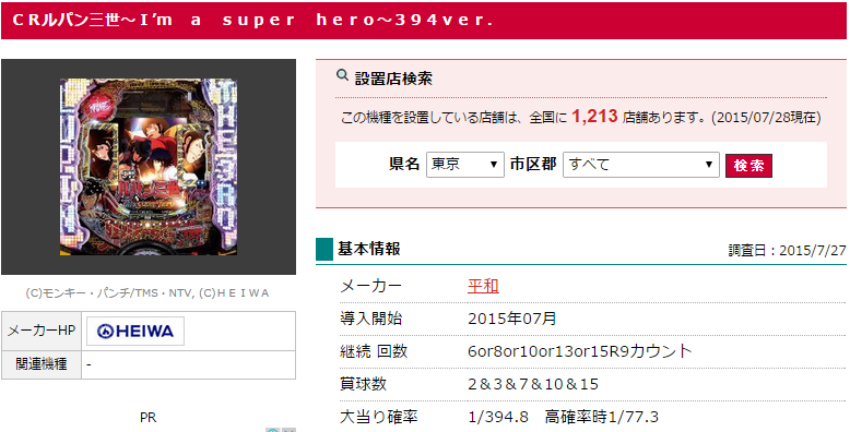 平和「CRルパン三世~I'm a super hero~」導入店舗は1,213