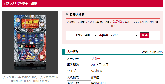 サミー「パチスロ北斗の拳 強敵」設置店舗数は3,742
