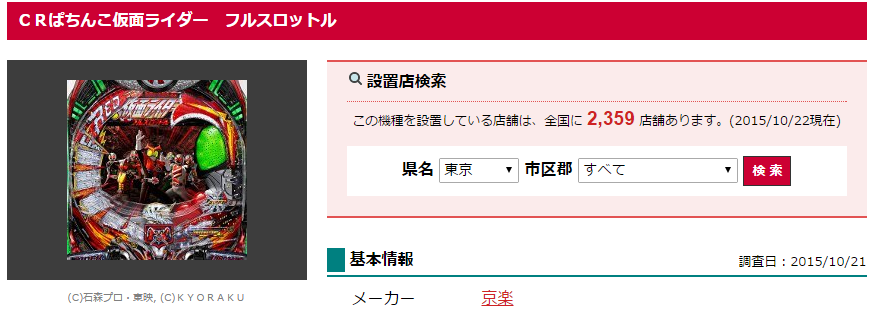 京楽「ぱちんこ仮面ライダーフルスロットル」設置店舗数は2,359