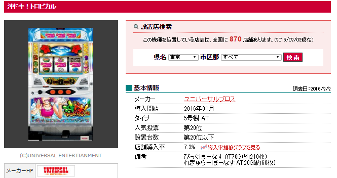 ユニバーサルブロス「沖ドキ!トロピカル」設置店舗数は870テンポ