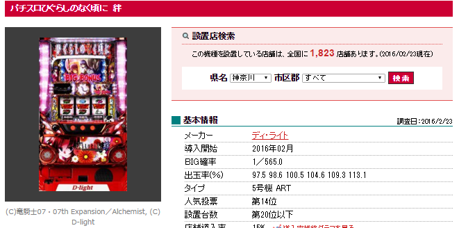ディ・ライト パチスロひぐらしのなく頃に絆 設置店舗数は1,823
