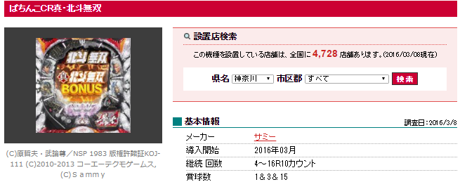サミー ぱちんこCR真・北斗無双 設置店舗は4,728店舗