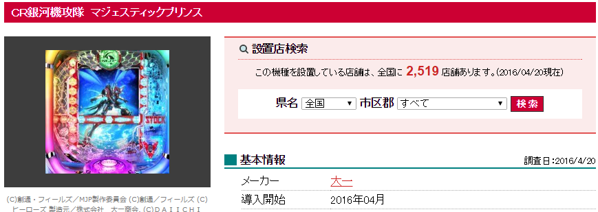 daiichi「CR銀河機攻隊マジェスティックプリンス」設置店舗は2,519