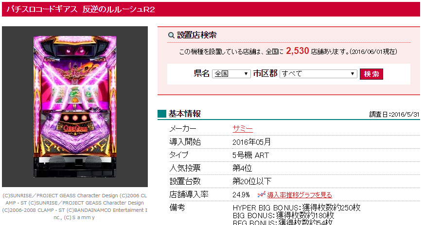 サミー「パチスロコードギアス 反逆のルルーシュ R2」 設置店舗は2,530店舗