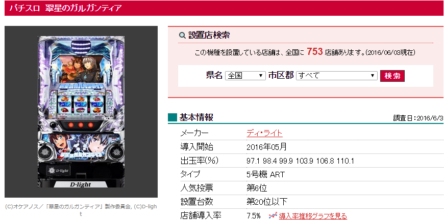 ディライト「パチスロ翠星のガルガンティア」設置店舗は753