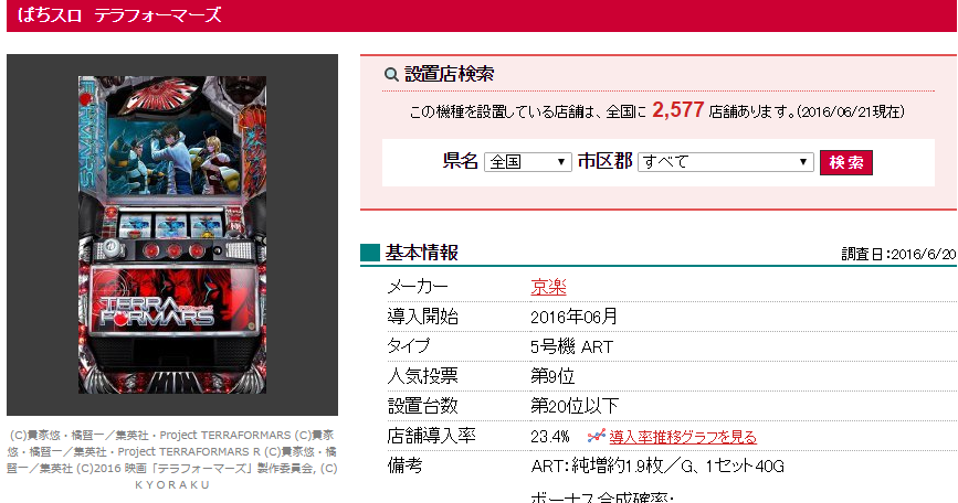 京楽「ぱちスロテラフォーマーズ」設置店舗数は2,577