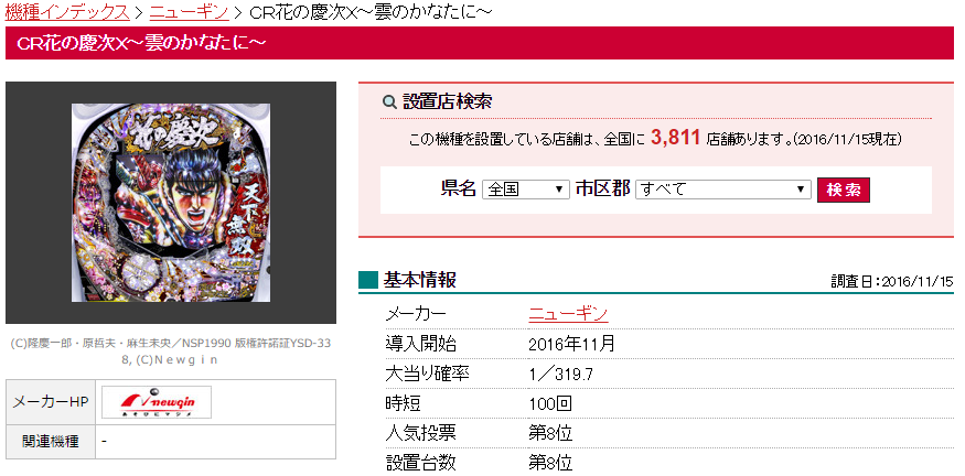ニューギン「CR花の慶次~雲のかなたに~」設置店舗数は3811店舗