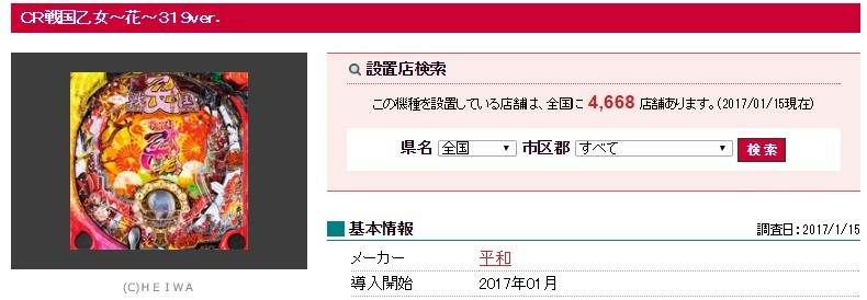 CR戦国乙女~花~319ver.設置店舗数は4,668店舗