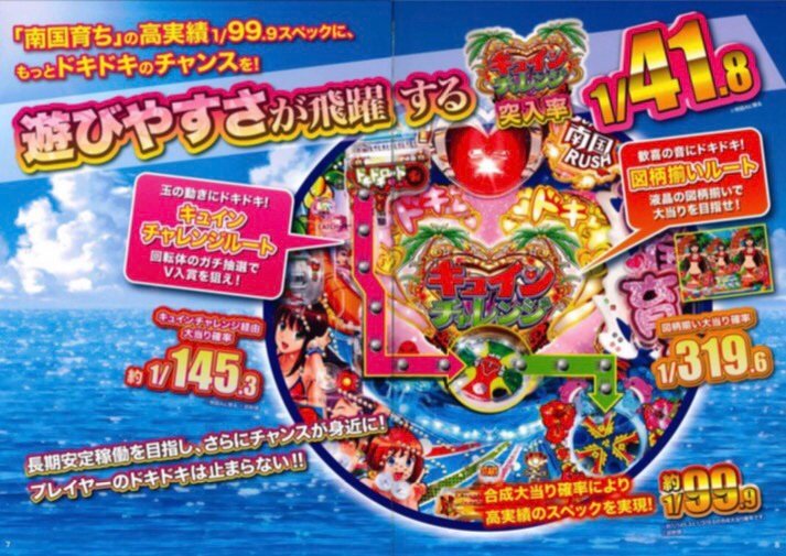 だとしたら南国RUSHはいつもの一種二種のスペックか、めちゃ萌みたいな役物確率1/3.5×時短5回みたいなスペックか