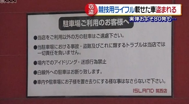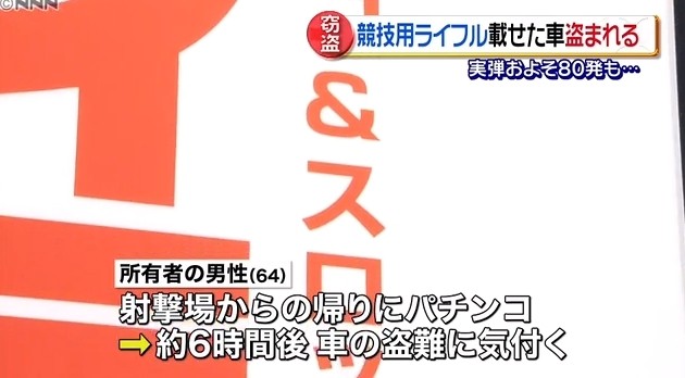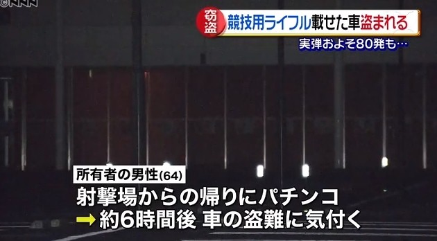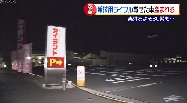 パチンコ店駐車場で車盗難、ライフル銃と銃弾約80発が盗まれる