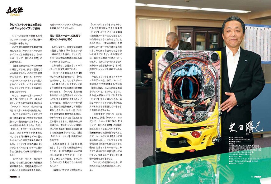 「『リング』の企画書を見た時、あんな恐ろしい世界観をパチンコでどう表現するんだろう、と少し戸惑いました。社員からも『こんな気持ち悪い台を打つユーザーはいるのか?』『怖いのは嫌いだから打たない!』といった反対意見も出て、企画プロジェクトの最初から物議を醸していました。それでも『誰もやらないことをやるからこそ意味があるし、メーカーとして認知されるんだ』という創業からの社風と、現在代表を務めている松元邦夫会長や井上孝司社長からの『創りたいのであれば、やってみろ』という押しもあり、キワモノ的なジャンルにもチャレンジしてみようじゃないかと開発がスタートしたのです」