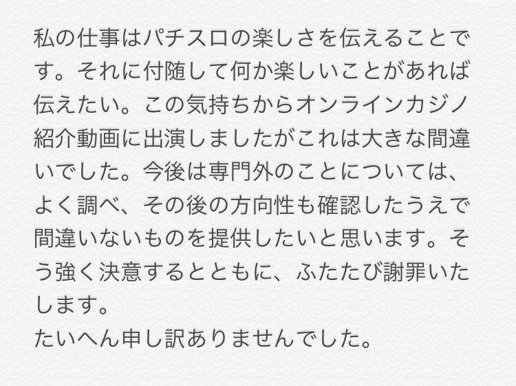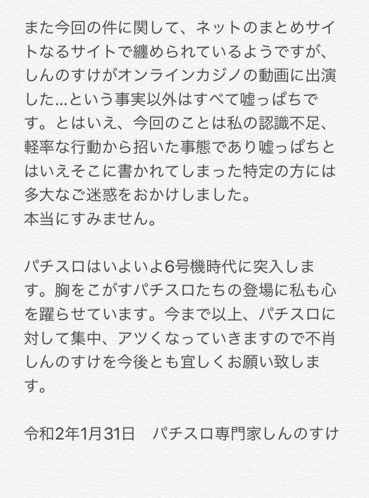 この前あったことについて説目します。自分の認識不足ならびに軽率な行動によりご迷惑をおかけした方、すみませんでした。今後ともパチスロと共に生きる、不肖しんのすけを宜しくお願い致します。 pic.twitter.com/mmawoCG9d3