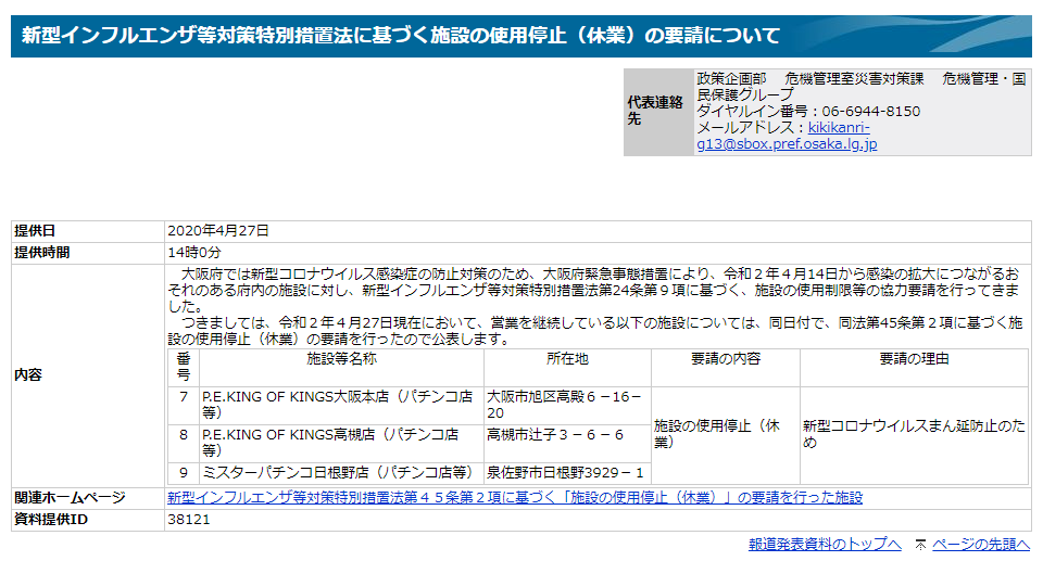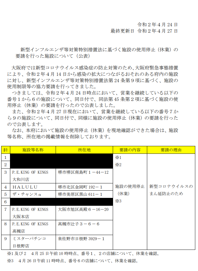 休業要請に応じない大阪府内のパチンコ店を追加で発表した。