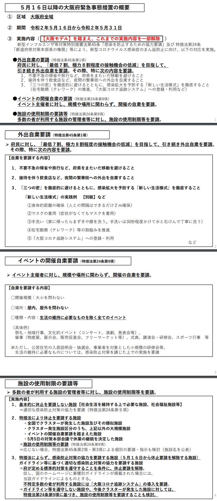 百貨店や図書館、映画館などの施設をはじめ、床面積が計1000平方メートル以下のパチンコ店などの遊興施設も解除対象として営業再開を認めた。飲食店は、従来より2時間延長し、営業時間を午後10時まで、酒類の提供を午後9時までと認めた。