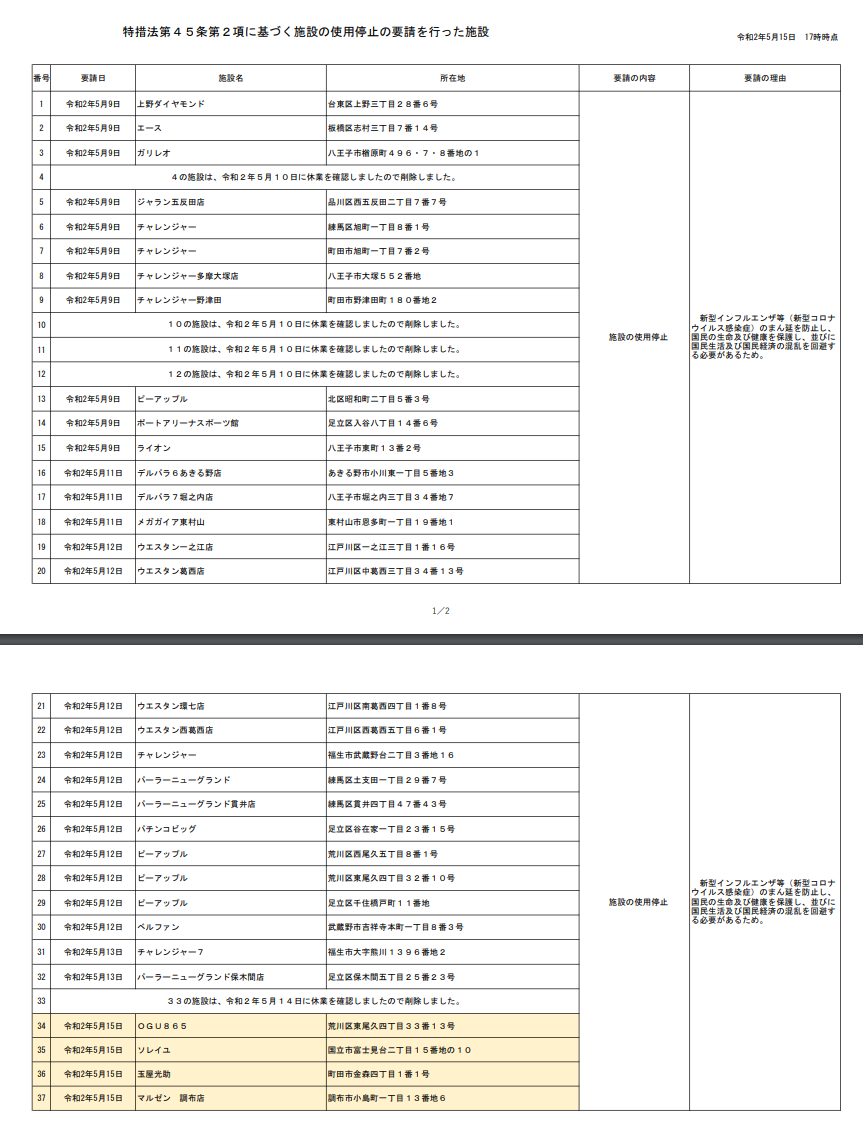 東京都と神奈川県が休業要請に応じないパチンコ店を追加公表