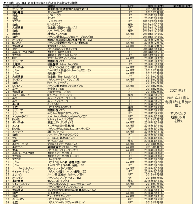 本稿では旧規則パチスロ機における機種毎の新たな撤去期限をまとめた(※撤去期限日は東京都公安委員会の検定通過日をもとに記載しており、実際は各地域によって異なる)。