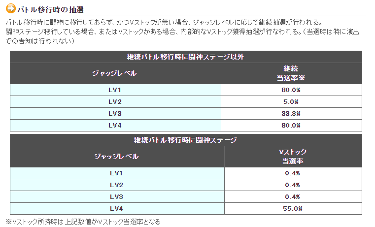 継続バトル移行時のジャッジレベルに応じて継続抽選を行い、当選すれば継続となる。