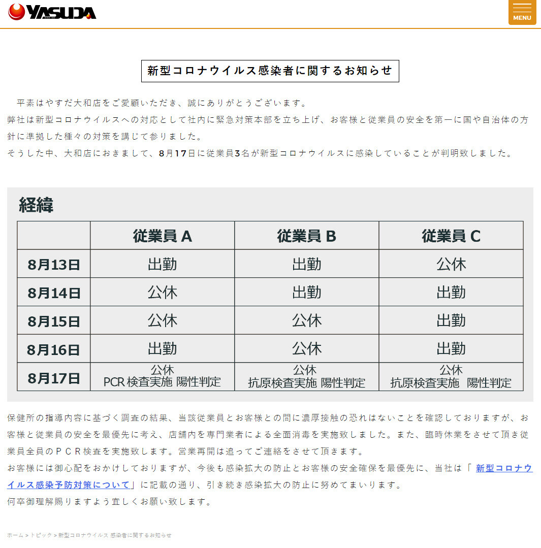 神奈川県大和市の「やすだ大和店」従業員3名が新型コロナウイルスに感染、全従業員のPCR検査の為休業へ
