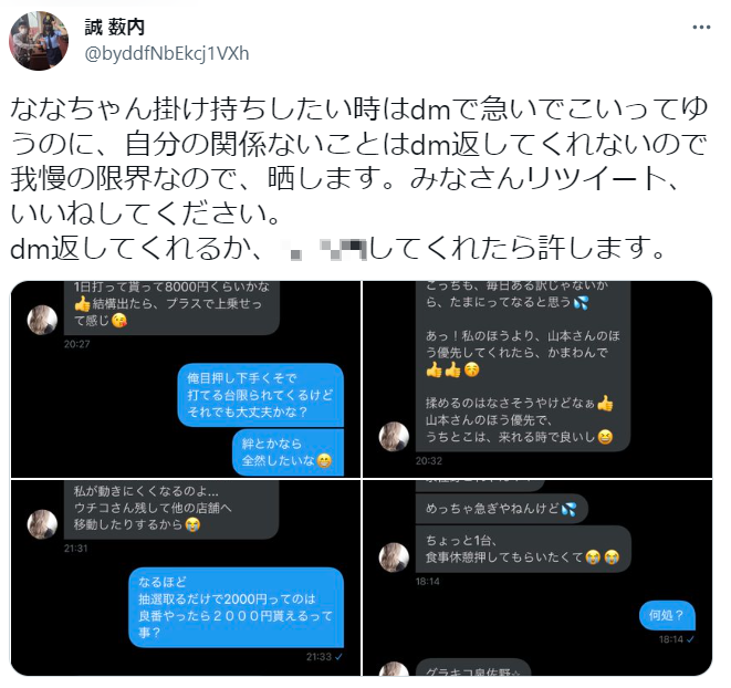 【画像あり】打ち子・引き子・掛け持ちが暴露された晒し屋・ななミルクティー一択さんが謝罪『申し訳ない。明日からまたツイート、稼働も頑張っていきます。』