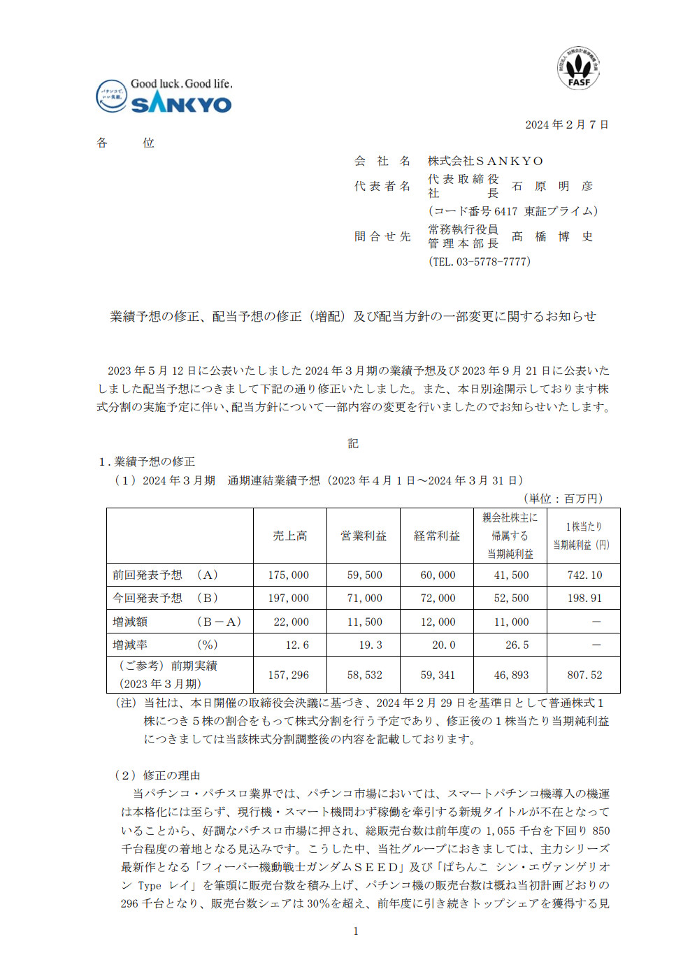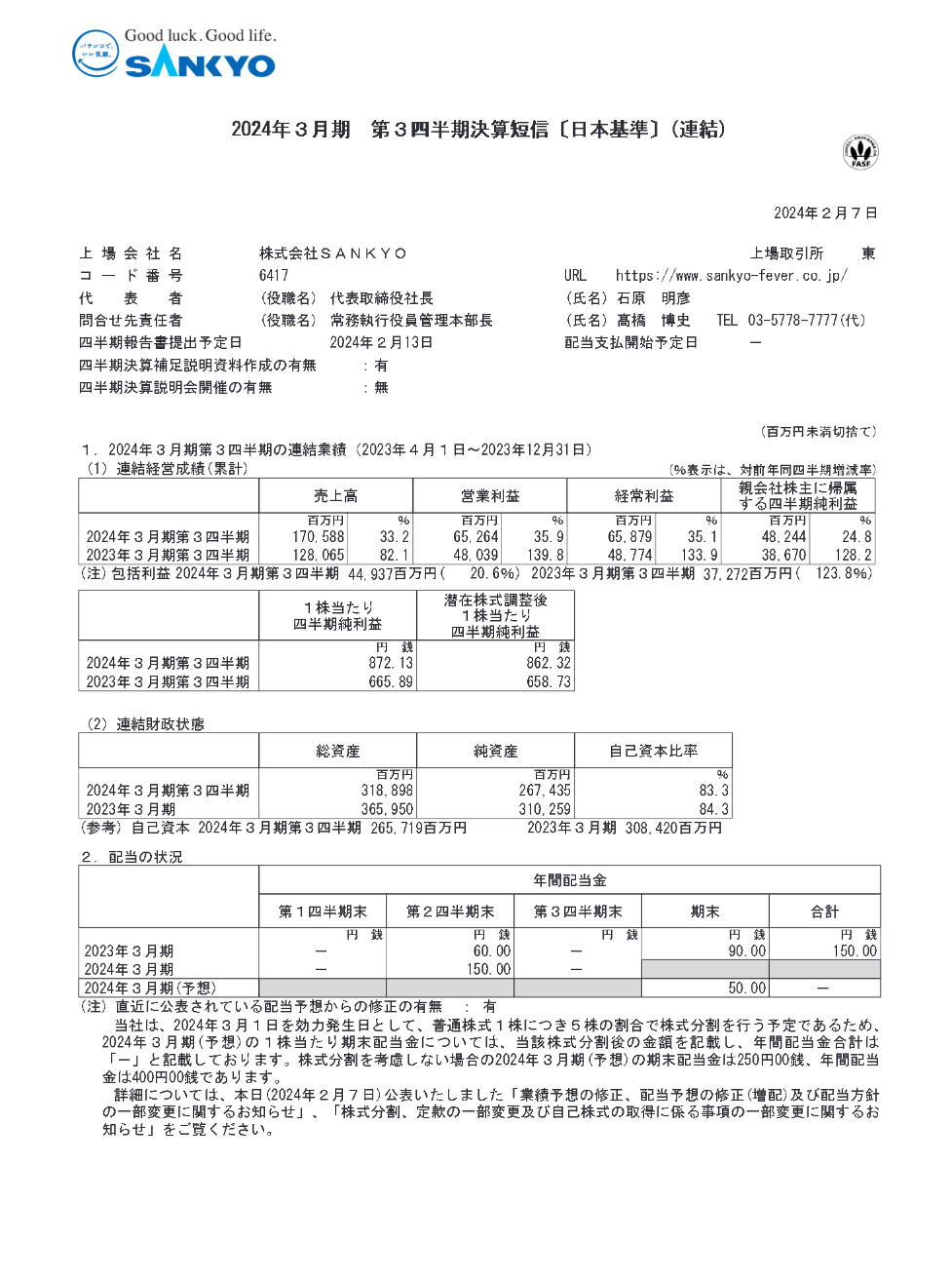 【朗報】SANKYOが2024年3月期連結業績予想を上方修正 売上高は1750億→1970億、営業利益595億→710億 パチの販売シェア30%超え、スマート遊技機の需要が増加