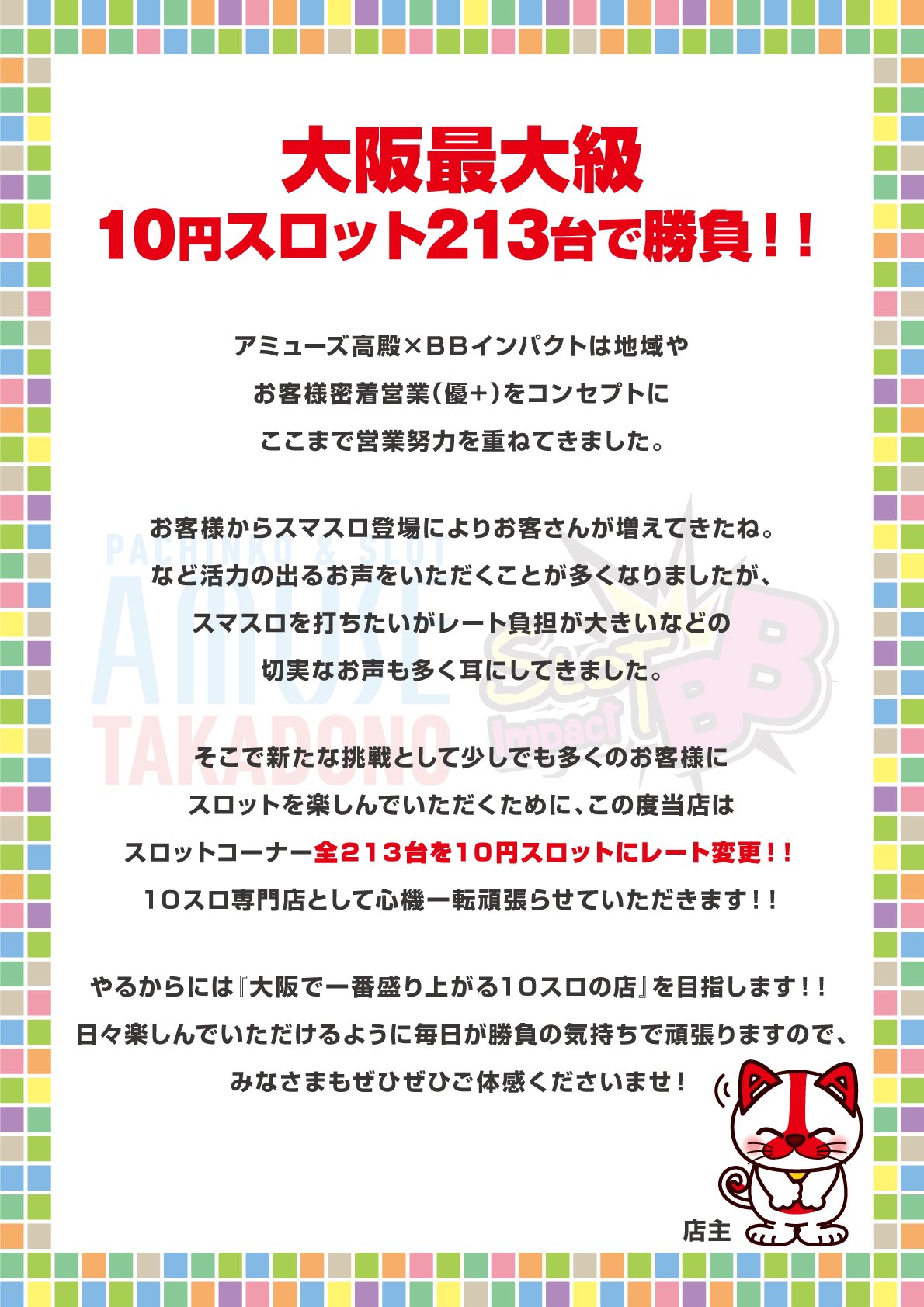 大阪のアミューズ高殿店「スマスロはレート負担が大きいって意見もあったのでスロットコーナー213台全てを10スロに変更したぞ」