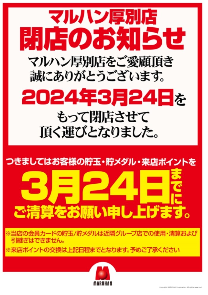 北海道札幌市厚別区大谷地東1-2-30にある「マルハン厚別店」も3月24日に閉店