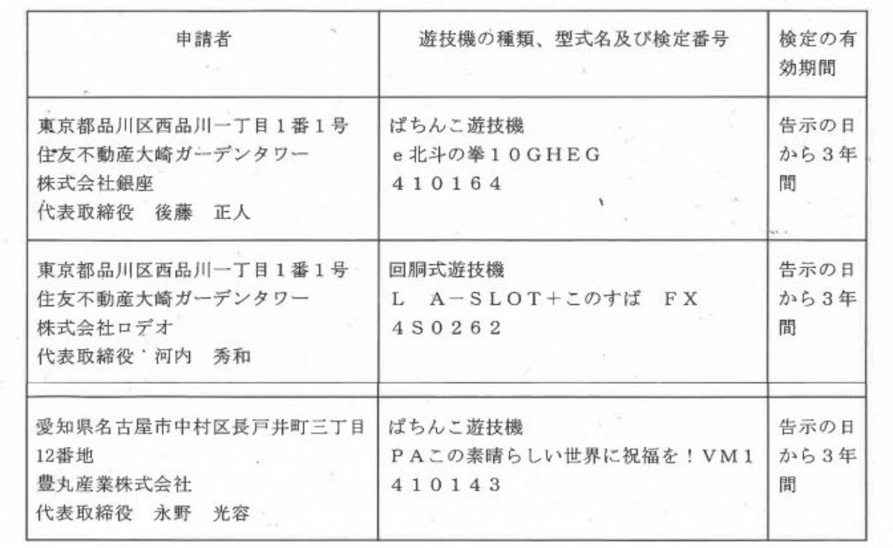 【新台】ロデオ「L A-SLOT+このすば FX」銀座「e北斗の拳10GHEG」豊丸「PAこの素晴らしい世界に祝福を!VM1」が検定通過