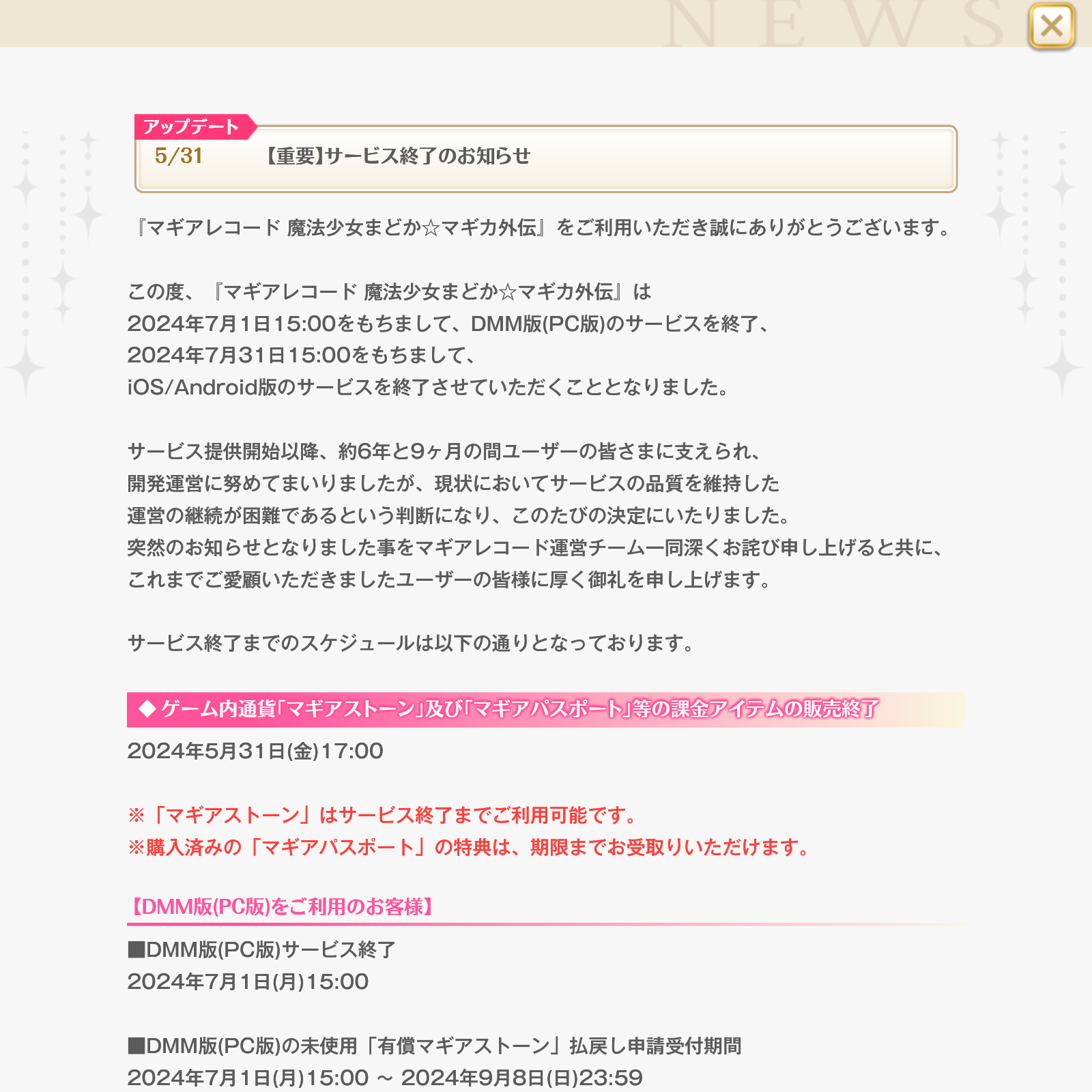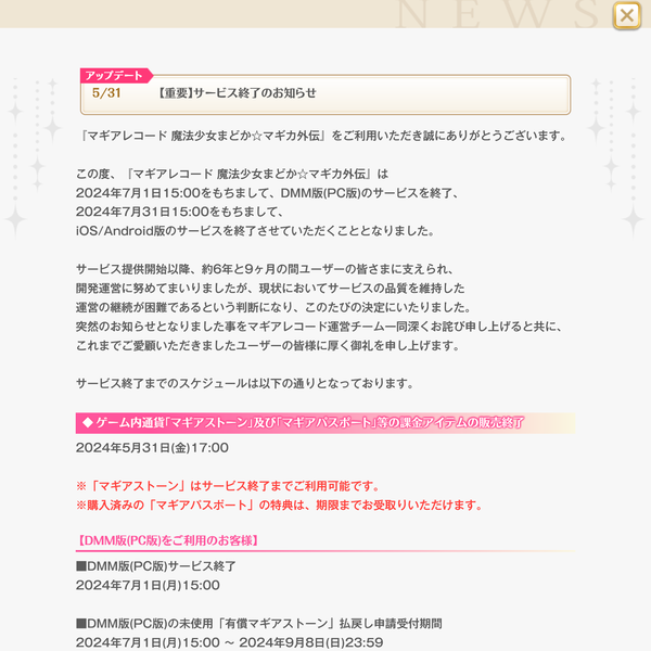 この度『マギアレコード 魔法少女まどか☆マギカ外伝』は下記日時をもちましてサービスを終了させていただくこととなりました。