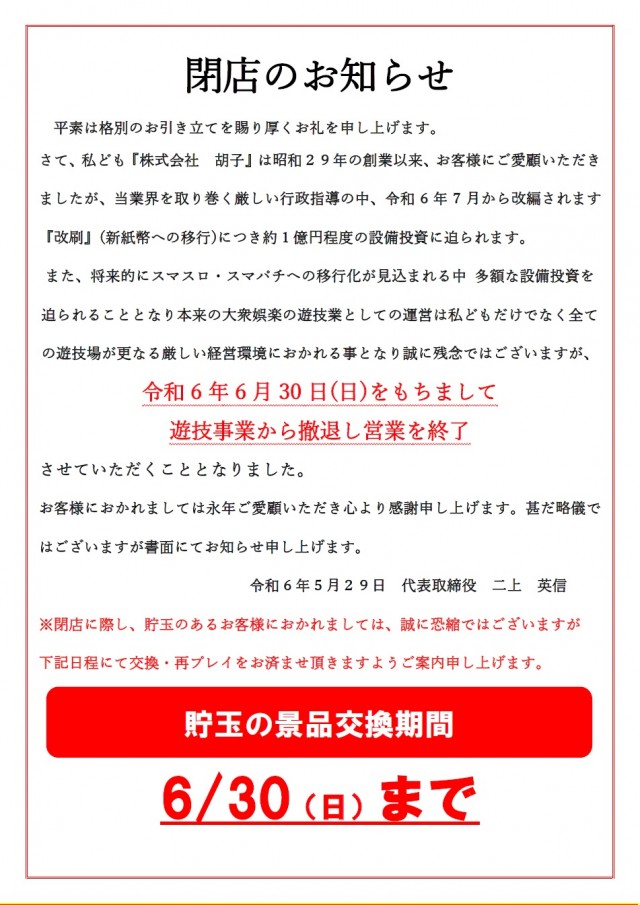 の遊戯場が更なる厳しい経営環境におかれる事となり誠に残念ではございますが、