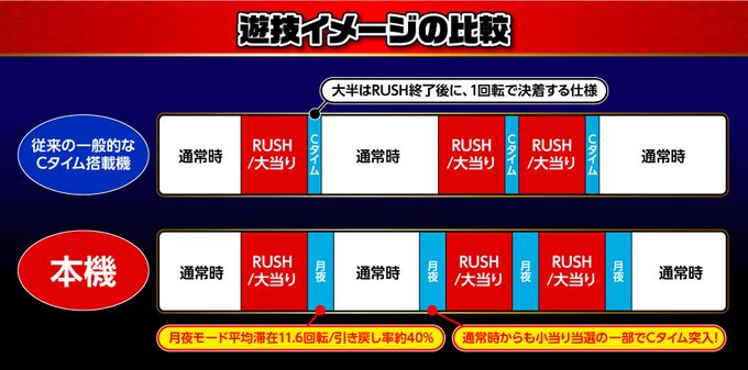 通常時のチャンス確率は1/199となっており、図柄確率は1/319とCタイム確率1/532の合算した数値で、図柄当りか、Cタイムのいずれかが当選する仕様です。RUSHは最大継続率約80%×ALL 10Rで約1100個獲得できます。RUSH転落後も必ずCタイムに突入。ここからさらにRUSH復帰を目指すゲーム性となっています。
