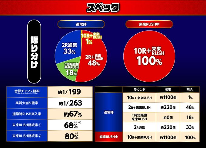 ※1通常時10R大当りと月夜モード中図柄揃い大当りからの突入は除く ※2来来RUSH(初回)の継続率約64.54%と残保留での引き戻し期待度約9.77%の合算値 ※3来来RUSH中の継続率約77.95%と残保留での引き戻し期待度約9.77%の合算値
