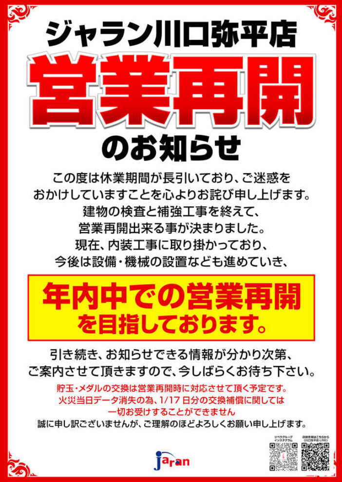 【朗報】2024年1月の火災で営業休止していた「ジャラン川口弥平店(埼玉県川口市)」年内中にも営業再開へ