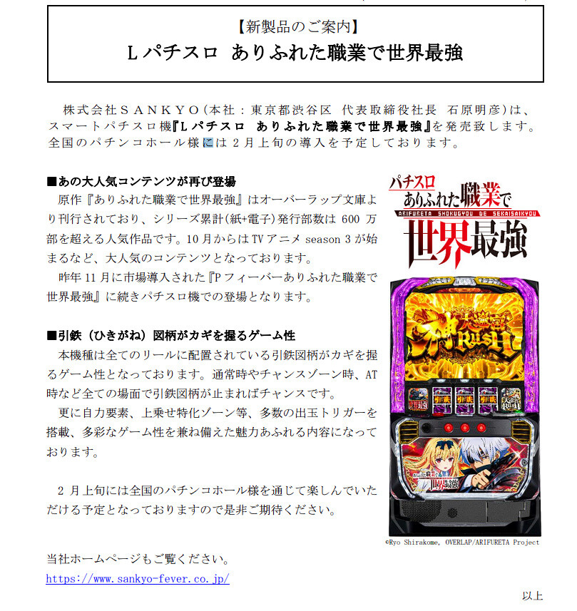 新台「Lパチスロ ありふれた職業で世界最強」先行映像公開!SANKYOパチスロが新たな世界に挑む!!!