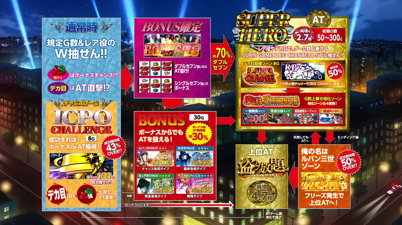 ただICPOチャレンジは不二子は突破でAT確定 ルパンvs銭形は突入時点でAT確定だから一番下の銭形と一個上のルパンは多分突破してもボナが多いと思う