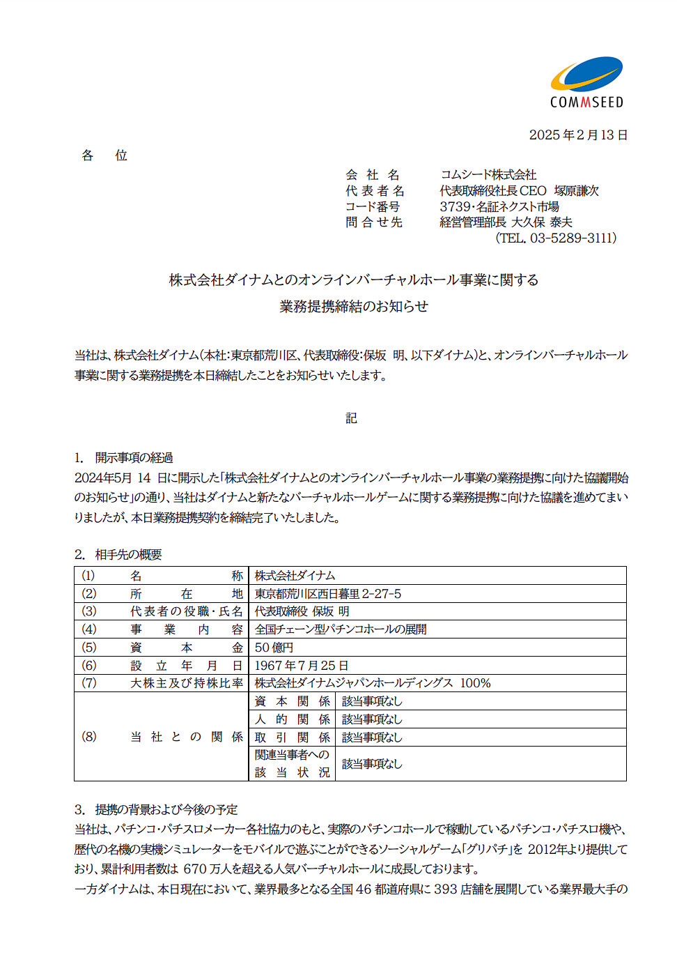 本日、業務提携のお知らせも開示しております。https://t.co/YX1tB3FP42#ダイナム#コムシード#スロスピ