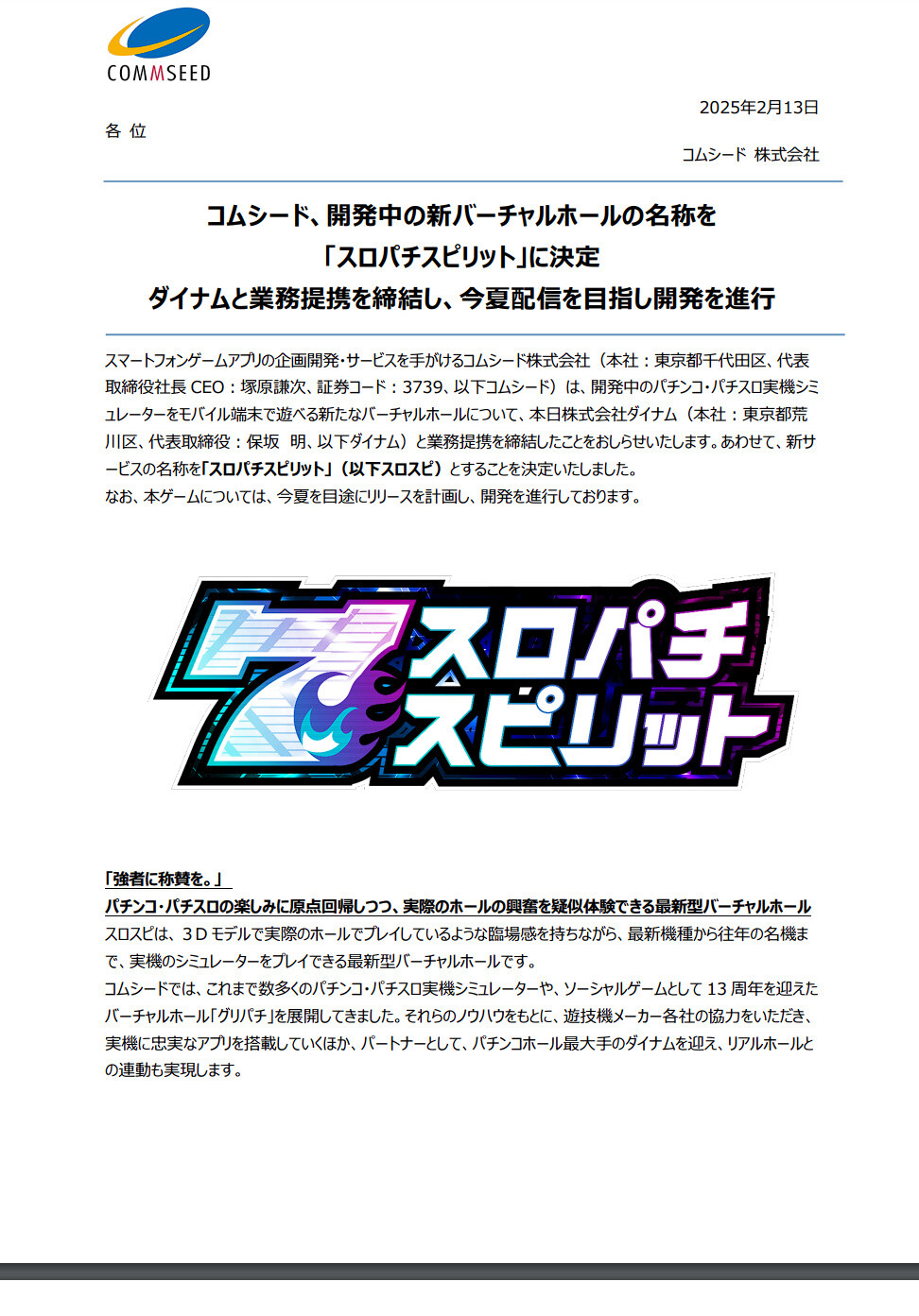 【プレスリリース】コムシード、開発中の新バーチャルホールの名称を「スロパチスピリット」に決定。ダイナムと業務提携を締結し、今夏配信を目指し開発を進行https://t.co/ftDwPVvWdS