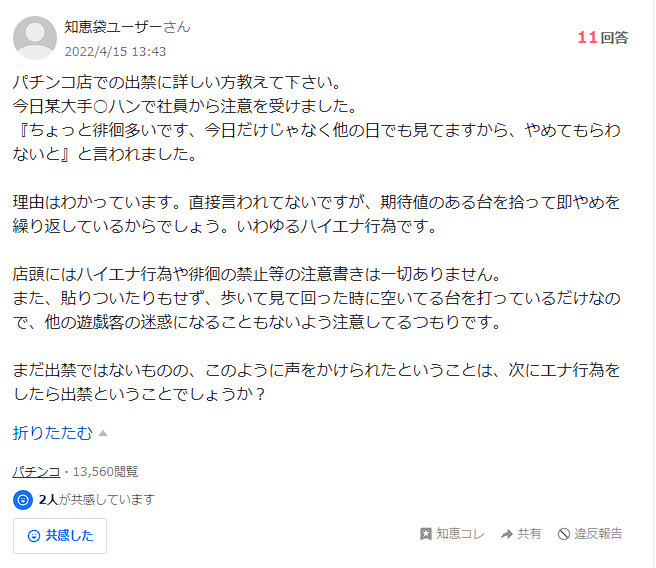 理由はわかっています。直接言われてないですが、期待値のある台を拾って即やめを繰り返しているからでしょう。いわゆるハイエナ行為です。 店頭にはハイエナ行為や徘徊の禁止等の注意書きは一切ありません。 また、 貼りついたりもせず、歩いて見て回った時に空いてる台を打っているだけなので、他の遊戯客の迷惑になることもないよう注意してるつもりです。