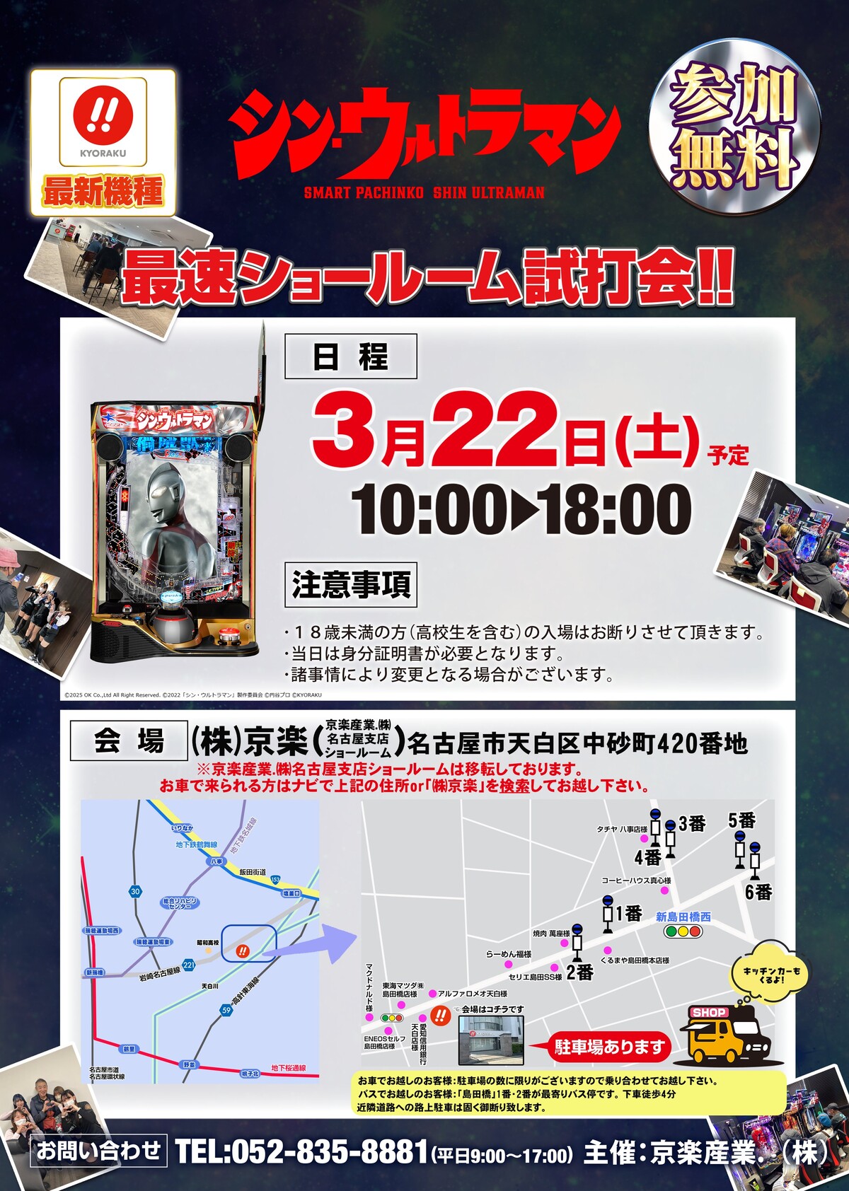 緊急告知📢 KYORAKU最新機種の試打会、開催決定! サンシャインKYORAKUスタッフがご案内します(^^)/ 日程→3/22(土)10:00〜18:00 機種→eシン・ウルトラマン 場所→京楽産業.㈱名古屋支店 注意事項→18歳未満(高校生を含む)の入場、参加はお断りさせて頂きます。 #シン・ウルトラマン試打会 pic.twitter.com/RvDWhB0mj7