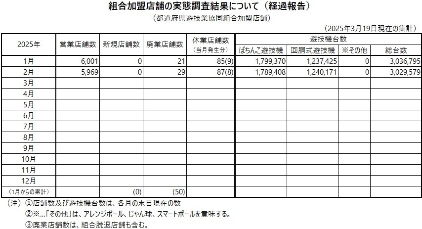 これによると2025年2月末時点での全日遊連加盟パチンコホールの営業店舗数は、前月比32店舗減の5,969店舗(前年同月比295店舗減)と、ついに6,000店舗割れとなった。