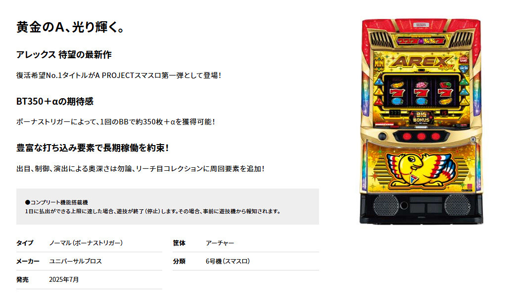 【新台】ユニバ「アレックス ブライト」製品サイト公開!BTにより1BBで約350枚+αを獲得可能!