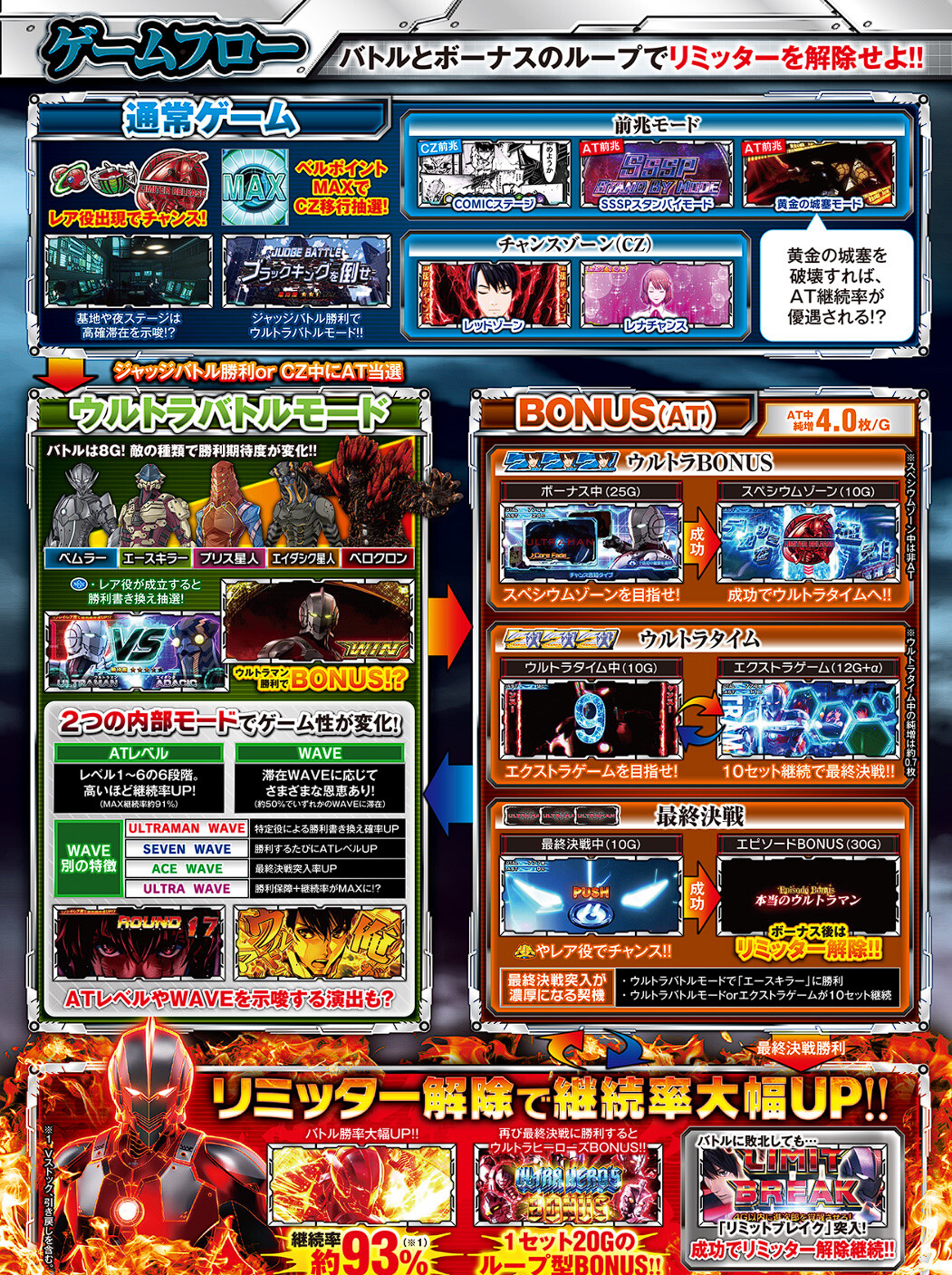 UBMはバトルATとなっており、バトルパートで勝利するとBONUSを獲得。ATレベル(約60%~約91%)の継続率管理で、純増約4.0枚の疑似BONUSとバトルパートがループし、ウルトラマンが倒れない限り続いていくシームレスSPECとなっています。