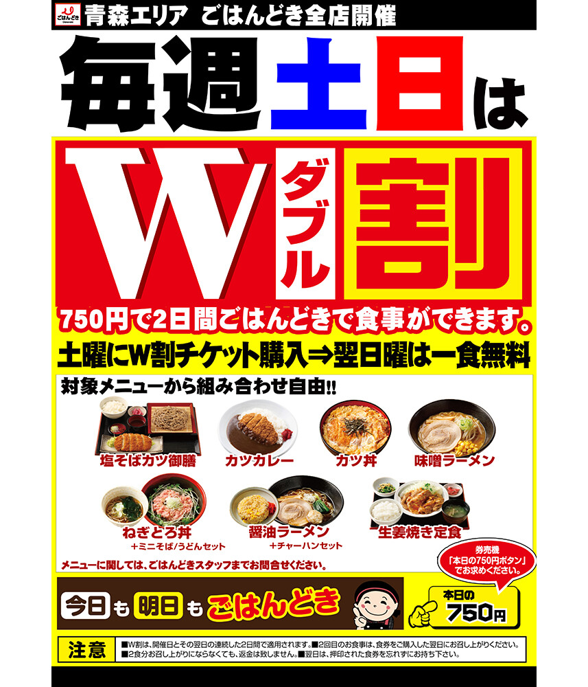 【青森エリア限定】7月の毎週土曜・日曜日はW割!土曜日にW割チケット購入で日曜日は1食無料で食べられるの😊 詳細は対象の店舗に確認してみてね🥰#ごはんどき #ごはんどきお得情報 pic.twitter.com/6wAF41Z4KK