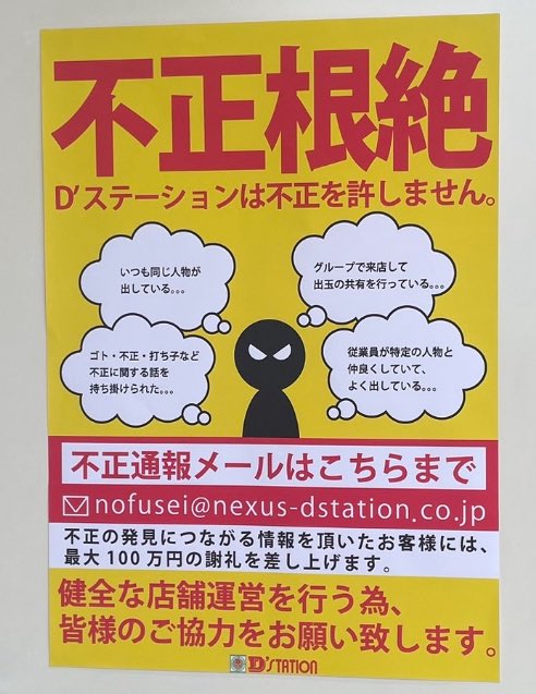 【朗報】パチンコチェーンD'STATION「不正は絶対に許さん。不正に繋がる情報には最大100万円の謝礼を出す」